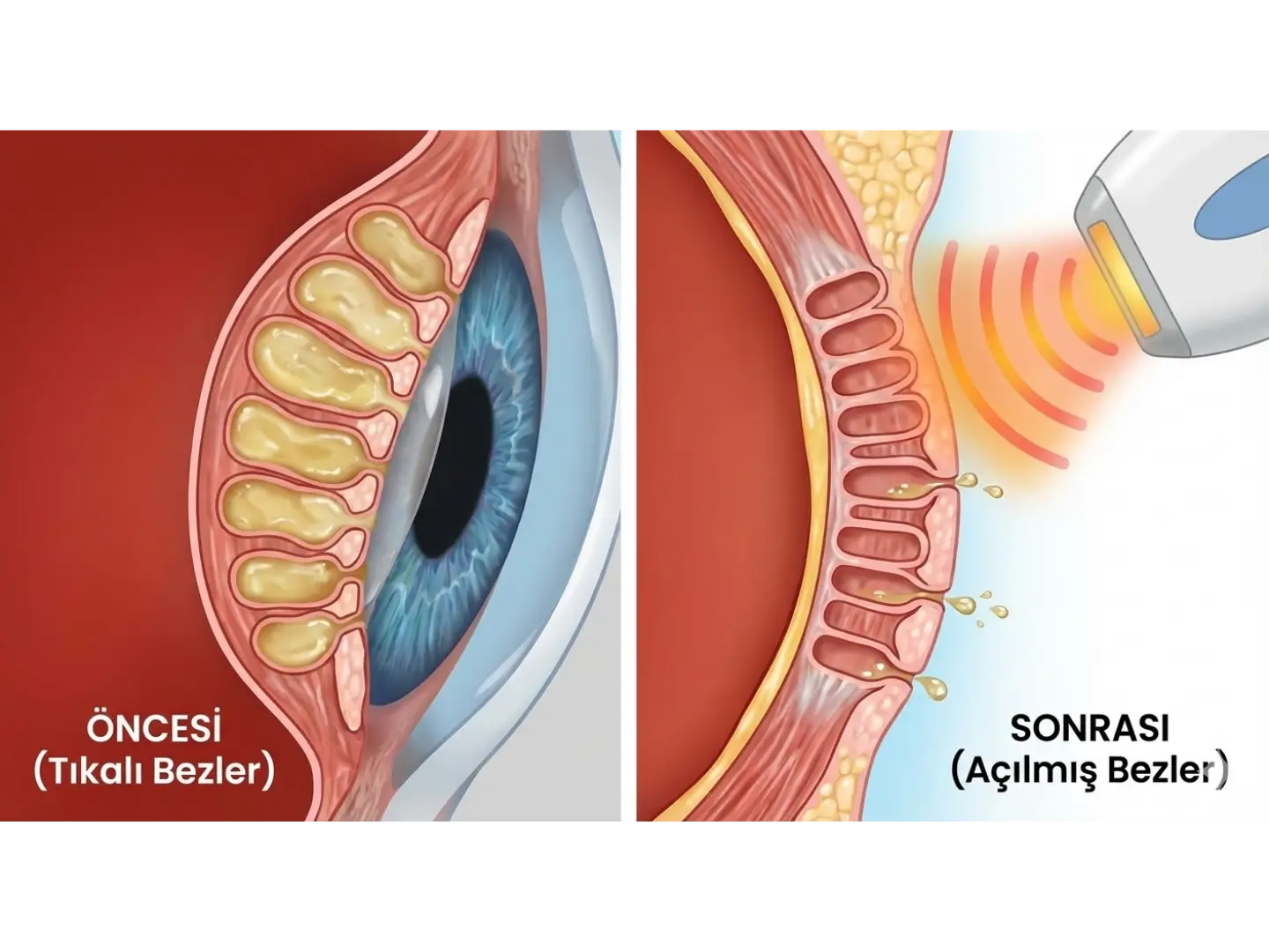 IPL (Intense Pulsed Light), yoğunlaştırılmış ışık enerjisi kullanarak yapılan yenilikçi bir tedavi yöntemidir. Göz çevresine uygulanan bu özel ışık dalgaları, cildin alt tabakalarına ısı yayarak tıkalı yağ bezlerini (Meibomius bezleri) eritir ve tekrar çalışmasını sağlar.