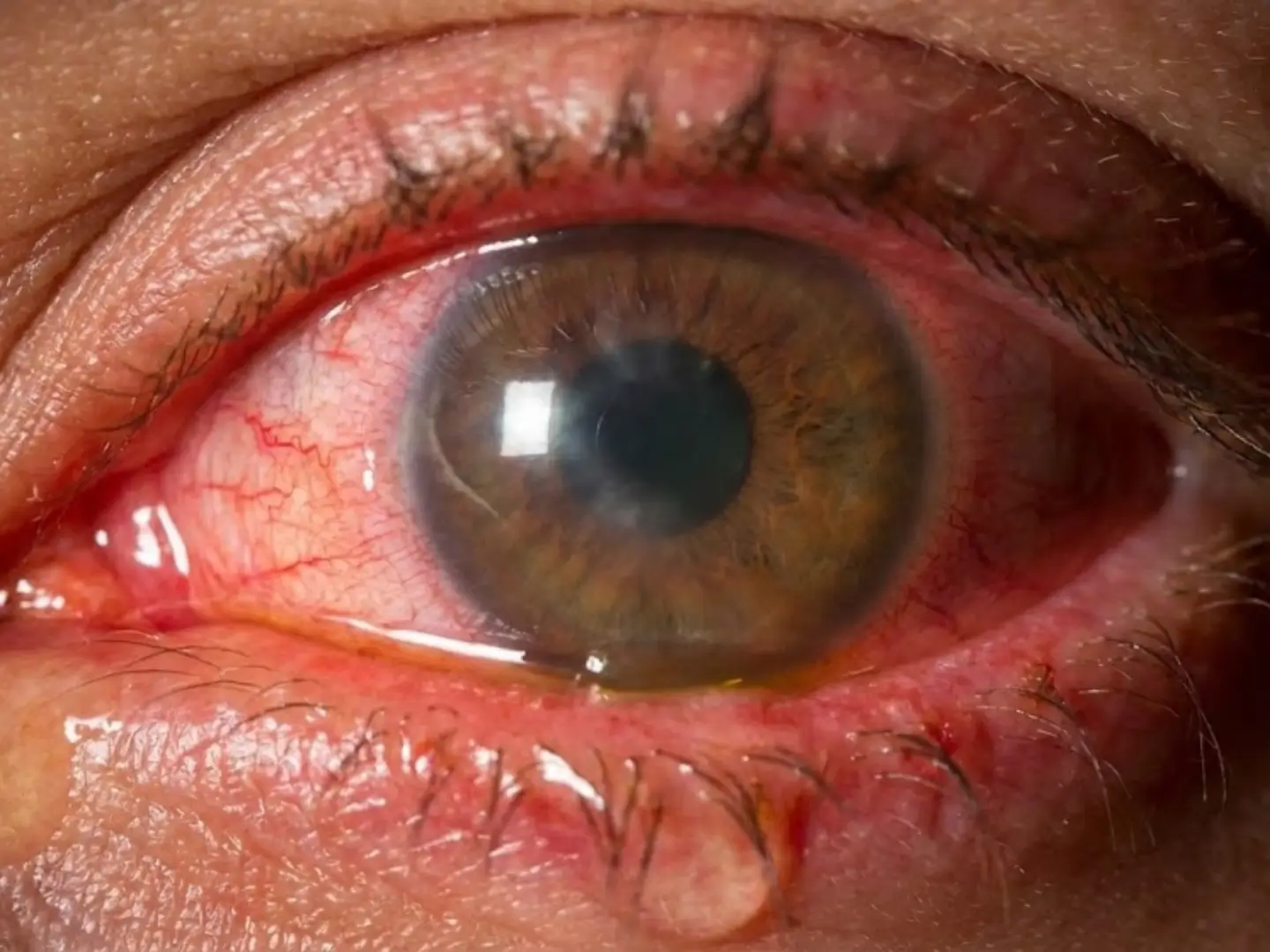 Göz, kimyasalı dışarı atmak için anında aşırı miktarda gözyaşı üretir. Gözün beyaz kısmı (konjonktiva) saniyeler içinde kanlanarak yoğun bir kırmızı renk alır.